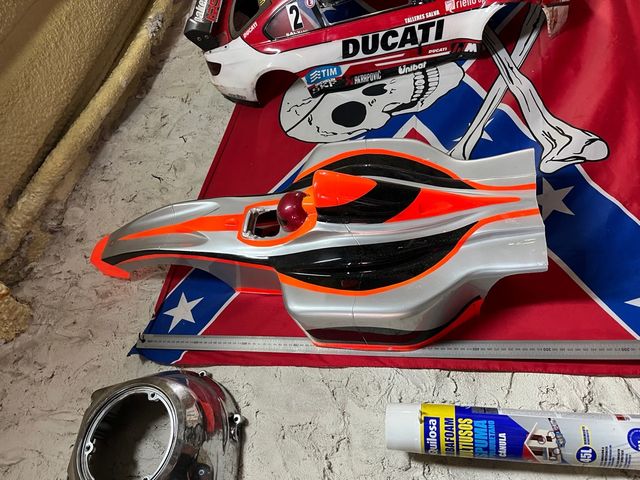 Carrocería de coche de radiocontrol a escala 1/5, estilo Fórmula 1. - Diseño aerodinámico. - Colores plateado, naranja y negro.