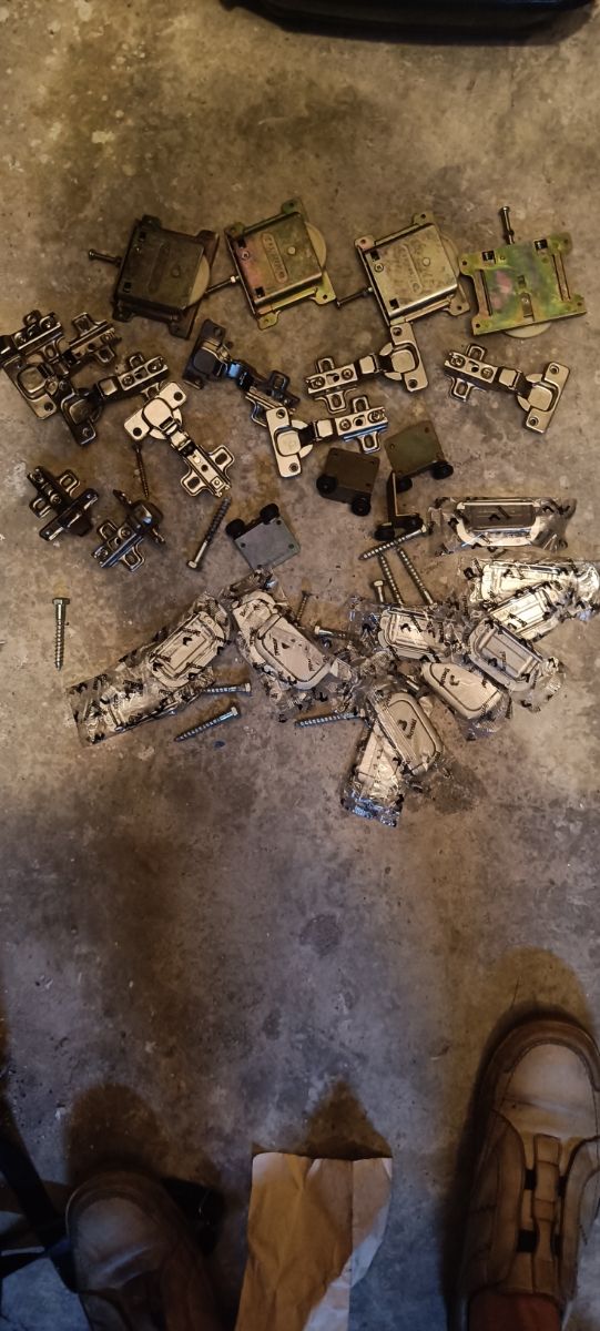 Detalles del productoLote de 4 carros para puerta corredera y 11 bisagras para puertas de cocina. Incluye varios juegos completos y tornillería.