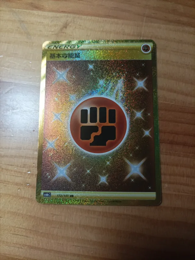 Carta de energía básica de Pokémon con un diseño dorado y brillante. - Diseño con el símbolo de puño. - Ilustración de estrellas brillantes.
