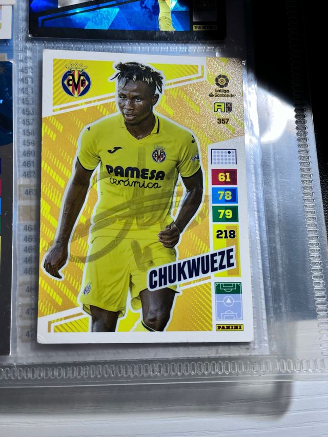 Carta de colección del futbolista Chukwueze del Villarreal CF. - Edición Panini LaLiga Santander. - firmada en persona en villareal