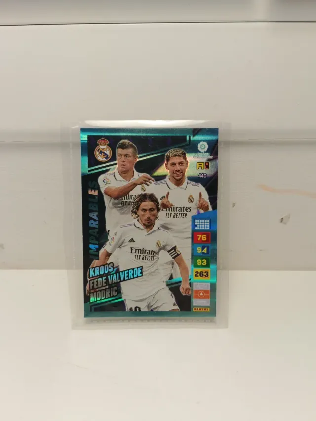 Detalles del productoCarta de la colección Imparables de la temporada 22/23 del Real Madrid. Muestra a los jugadores Kroos, Fede Valverde y Modric.