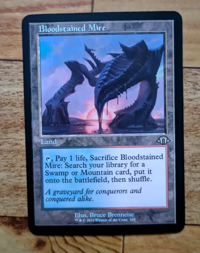 - Habilidad: Pagar 1 vida, Sacrificar Bloodstained Mire: Busca en tu biblioteca una carta de Pantano o Montaña, ponla en el campo de batalla, luego baraja.