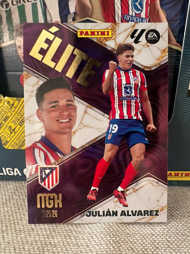Carta coleccionable Élite de Julián Álvarez de la colección Panini MGK. - Edición 2025/26. - Número 8 - Diseño con detalles dorados y mármol.