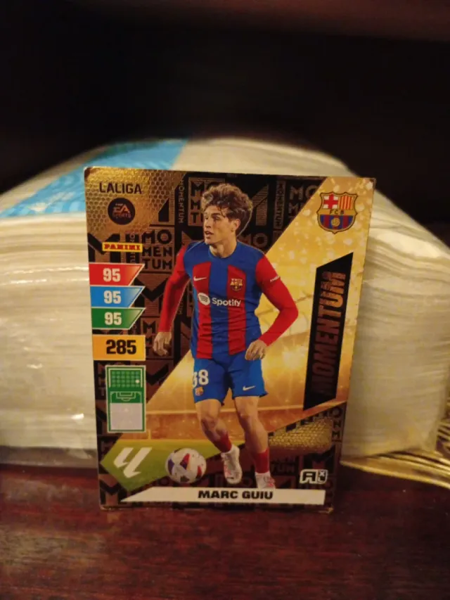 Carta de fútbol Panini LaLiga Momentum del jugador Marc Guiu. - Número de carta: 285 - Puntuaciones: 95, 95, 95 - Liga: LaLiga - Marca: Panini EA Sports