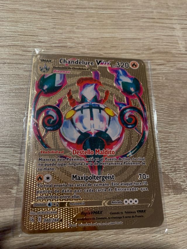 Carta Pokémon Chandelure VMAX dorada. - Habilidad: Destello Maldito. - Ataque: Maxipoltergeist. - Ilustrador: AKIRA EGAWA. - Número de carta: 040/264.