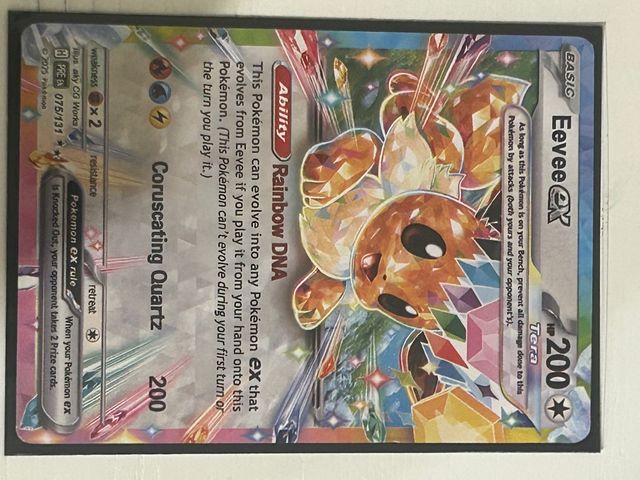 Detalles del productoCarta Pokémon Eevee EX, número 075/131, con su funda protectora.
