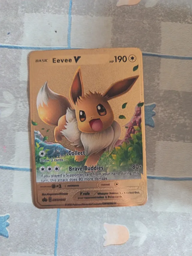 Carta Pokémon de Eevee V, edición dorada. - Tipo: Básico - HP: 190 - Ataque: Brave Buddies (80+) - Ilustrador: Kagemaru Himeno - Código: SWSH065 - Año: 2020