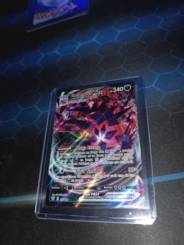 Detalles del productoEsta carta Pokemon Eternatus VMAX está en perfecto estado. Se encuentra en una funda protectora.