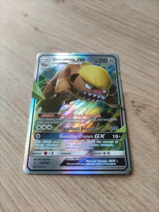 Carta Pokémon de Gumshoos GX. - Número de carta: 110/149. - Habilidad: Search the Premises. - Ataque: Headbutt Bounce y Gumshoe Chance GX. - Año de publicación: 2017.