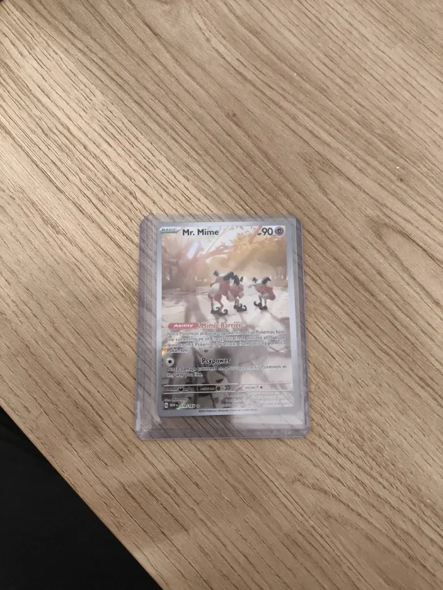 Carta Pokémon de Mr. Mime. - Tipo: Básico - HP: 90 - Habilidad: Mimic Barrier - Ataque: Psypower
