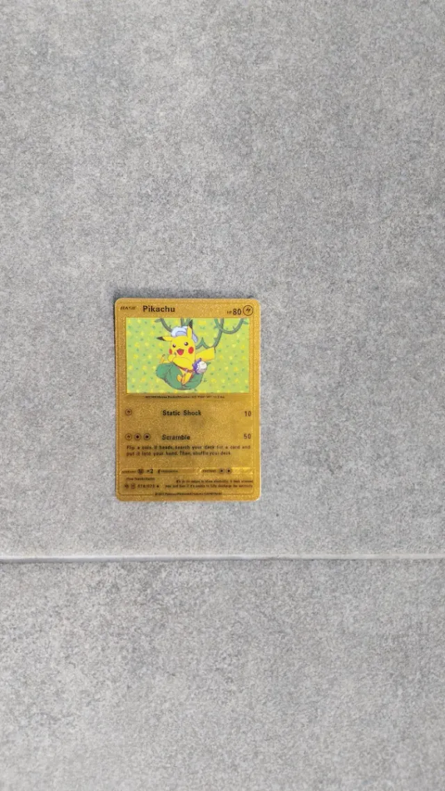 ESCUCHO OFERTAS Carta Pokémon de Pikachu con acabado dorado. - Ataque: Static Shock (10) - Habilidad: Scramble (50) - Número de carta: 074/073