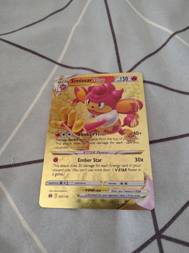 Detalles del productoSe vende una carta Pokémon Simisear V-Star.  Es una carta dorada, en excelente estado.