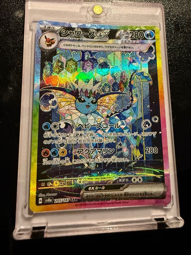 Carta Pokémon de Vaporeon EX. - Ilustración de Narano. - Número de carta 205/187 SAR. - Incluye regla de EX.