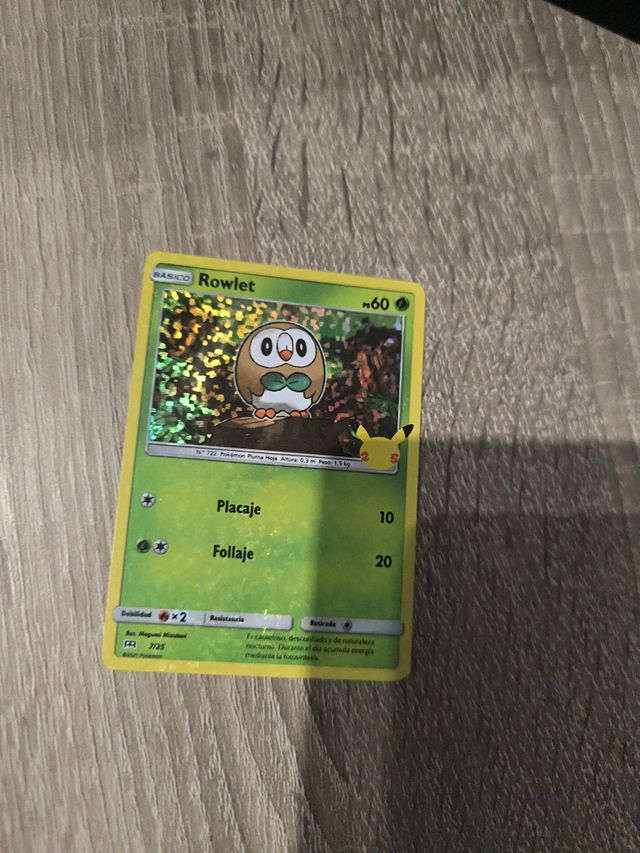 Detalles del productoCarta Pokémon Rowlet holográfica del 25 aniversario.