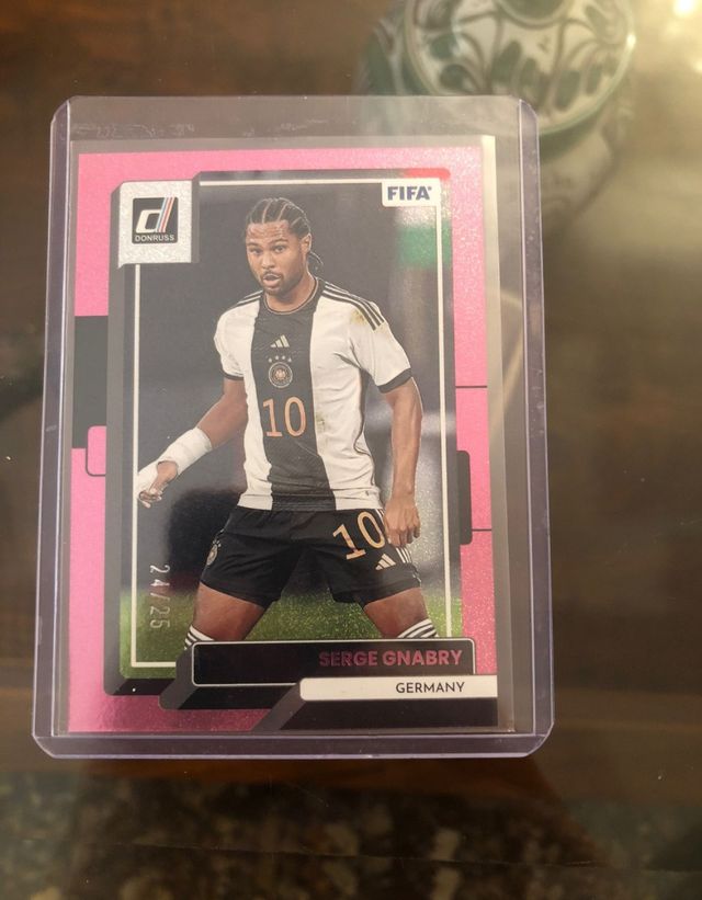 Vendo una carta coleccionable de Serge Gnabry. Es una carta de la colección Panini FIFA, numerada 24/25. La carta está en perfecto estado y se encuentra en una funda protectora.