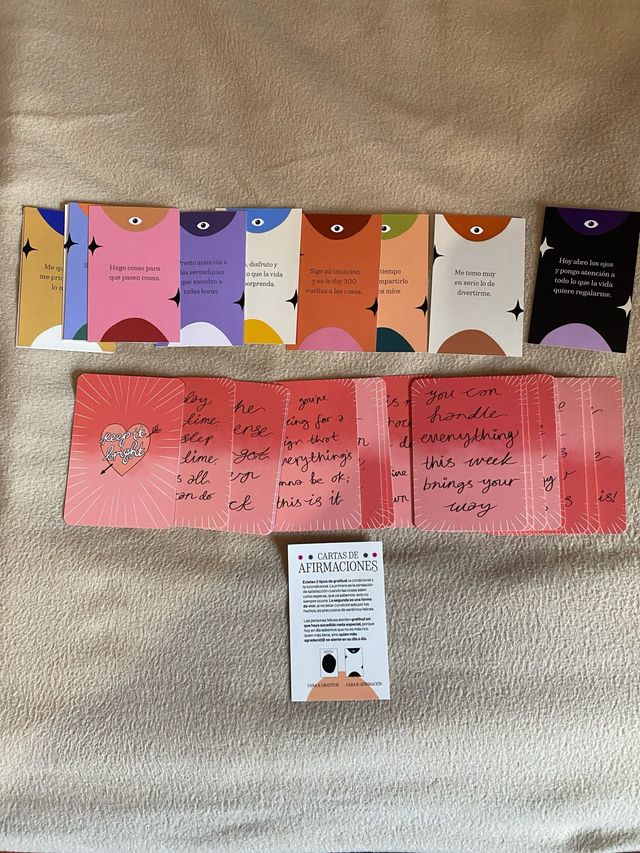 Detalles del productoConjunto de cartas de afirmaciones para el crecimiento personal y la positividad. Incluye un folleto explicativo.
