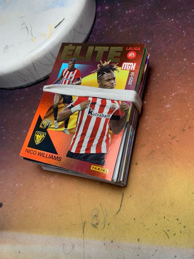 Detalles del productoVendo una colección de cartas de fútbol de la liga española LaLiga. Son cartas de la colección Elite de la temporada 2023-24 de Panini. Incluyen varias cartas de Nico Williams. - Están en perfecto estado. - Se venden juntas. - Un total de 60 cartas. - Son cartas de la colección Elite de Panini.