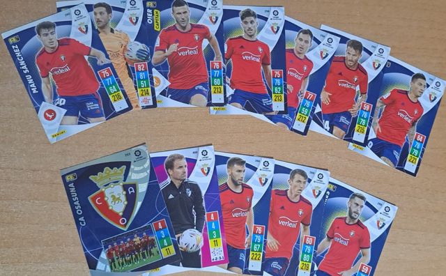 Detalles del productoSe venden cartas de cromos de la colección Panini de la Liga Santander del equipo C.A. Osasuna. Las cartas están en buen estado.