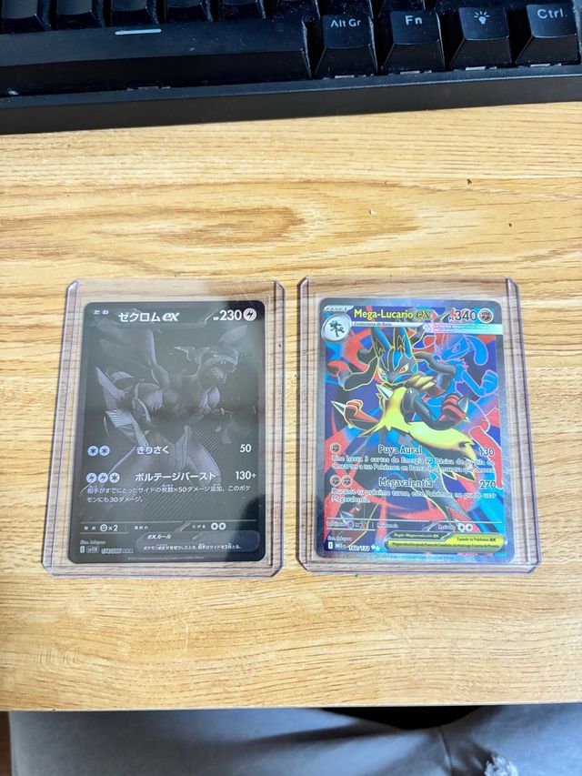 Dos cartas Pokémon coleccionables. - Mega-Lucario EX con 340 de HP. Megaevolucion (Español) - Zekrom EX con 230 de HP. Black Bolt (Japonesa)
