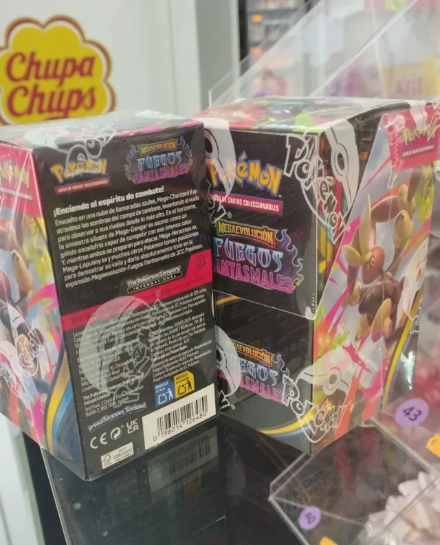 Detalles del productoCaja de cartas coleccionables de Pokémon, expansión Megaevolución Fuegos Fantasmales.