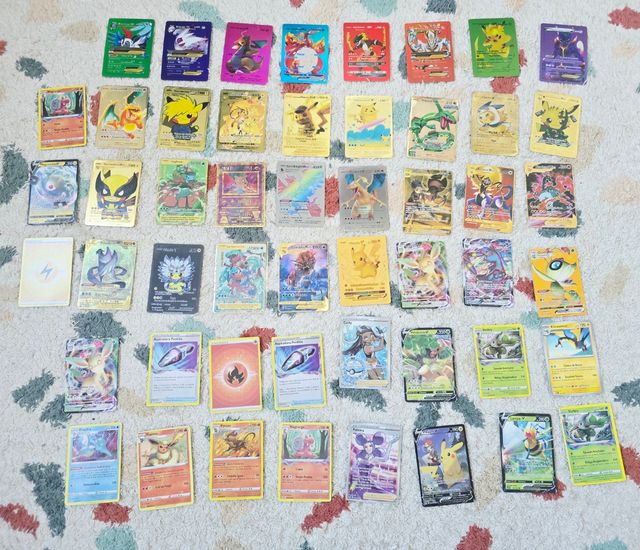 Detalles del productoColección de cartas Pokémon, algunas con acabado metálico y otras normales.