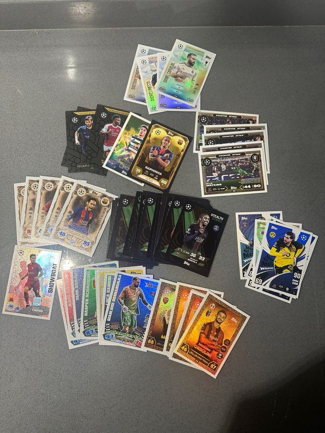 Colección de cromos de fútbol Topps Match Attax de la temporada 25/26. Incluye cartas de Man of the Match y Wildcard.