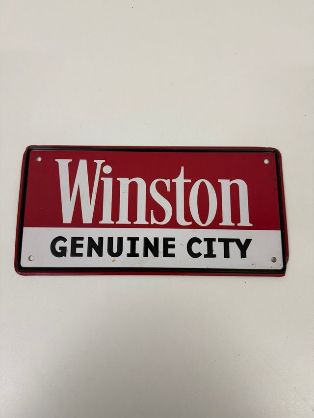 Cartel decorativo de chapa con el logo de Winston. Mide unos 30x15 cm - Diseño retro. - Colores rojo y blanco. - Texto Genuine City.