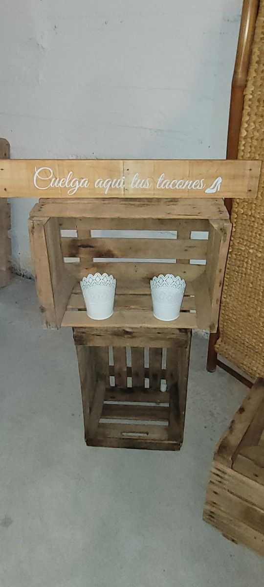 Cartel de madera realizado con un vinilo para nuestra boda. Lo puse encima de unos palets junto con varios carteles.