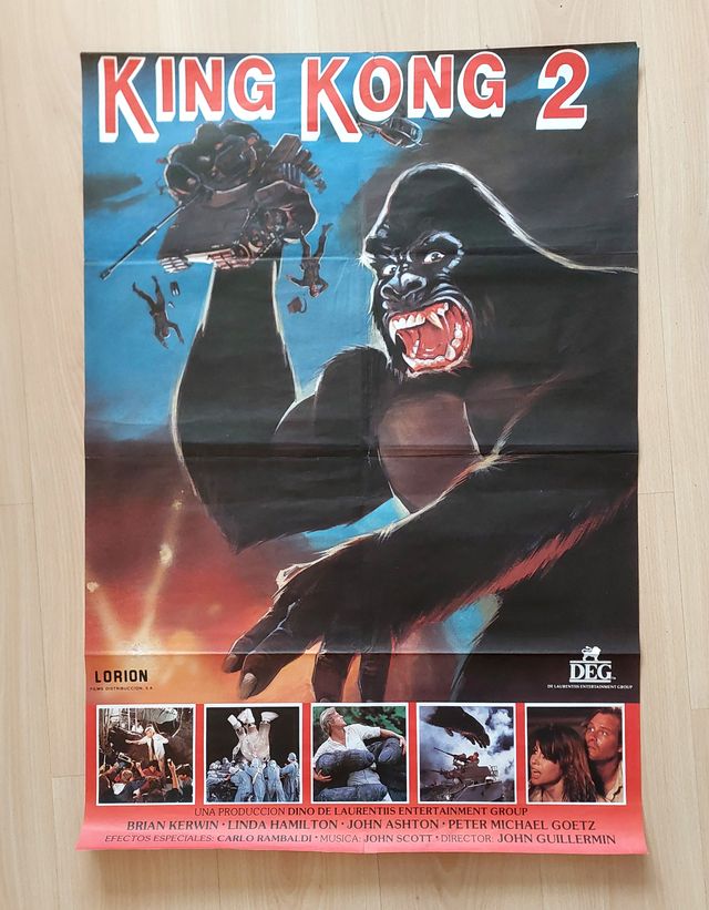 Detalles del productoCartel de cine original KING KONG II (1986). Expuesto en los cines de España el día de su estreno. El estado es el que muestran las imágenes (ver fotos). Una pieza de coleccionista. Papel e impresión offset. Tamaño 70x100 cm.