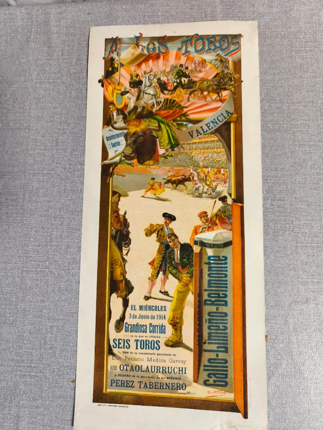 Detalles del productoCartel original de A los Toros de Valencia, con fecha del 3 de junio de 1914. Presenta una corrida Grandiosa con seis toros.