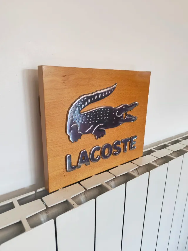 Detalles del productoCartel de la marca Lacoste con su icónico logo del cocodrilo fabricado en metal y sobre una base de madera.