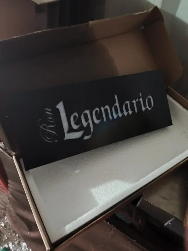 Cartel decorativo con el logo de Ron Legendario. Ideal para coleccionistas o amantes de la marca. - Diseño negro con letras blancas. - Texto: Ron Legendario.