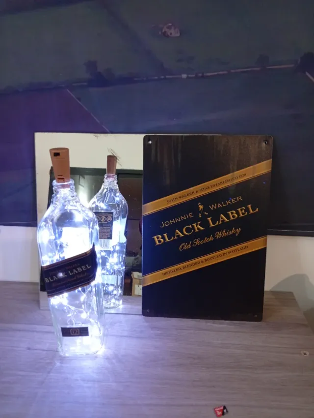 Detalles del productoSe vende cartel de aluminio de Johnnie Walker junto con una botella decorada con luces LED.