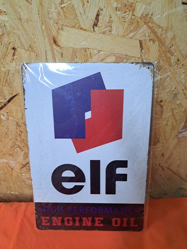 Cartel decorativo de la marca Elf. - Diseño con el logo de Elf y texto High Performance Engine Oil. - Fabricado en metal. - 20x30cm.
