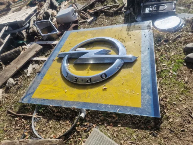 Detalles del productoCartel de gran tamaño con el logo metálico de Opel de un antiguo concesionario. Un distintivo icónico para coleccionistas o entusiastas de la marca.
