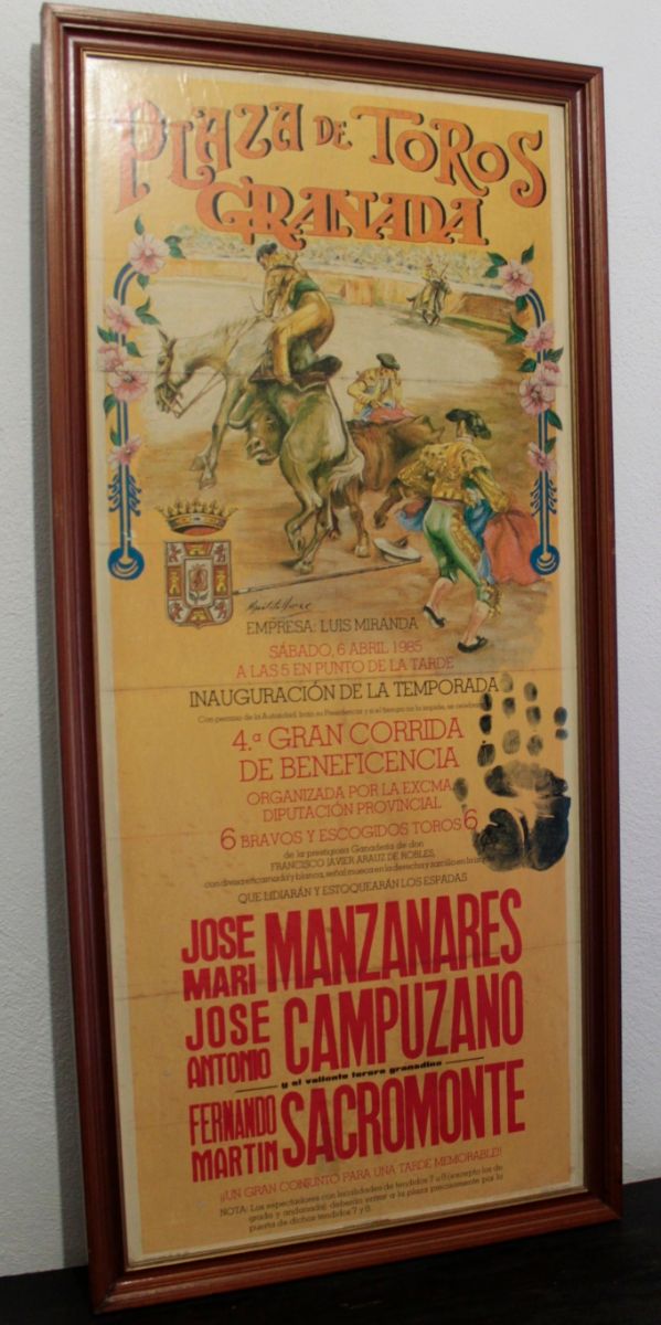 Corrida de toros del 6 de abril de 1985 en la plaza de toros de Granada, de papel sobre tabla enmarcado en madera. Medidas: 105 x 48 cm.