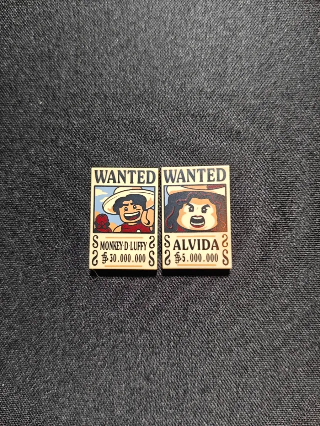 Detalles del producto2 carteles de Se Busca de Lego inspirados en One Piece. Incluyen los personajes de Monkey D. Luffy y Alvida. Ya tengo los 8 carteles y estos dos me sobraron.