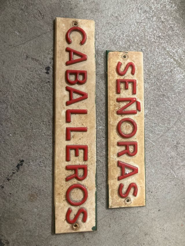 Detalles del productoConjunto de dos carteles para baños, uno para CABALLEROS y otro para SEÑORAS.