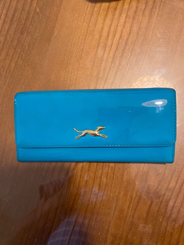 Cartera azul turquesa de charol alargada. Solo tiene roce por un lado (ver foto). Interiores en perfecto estado.