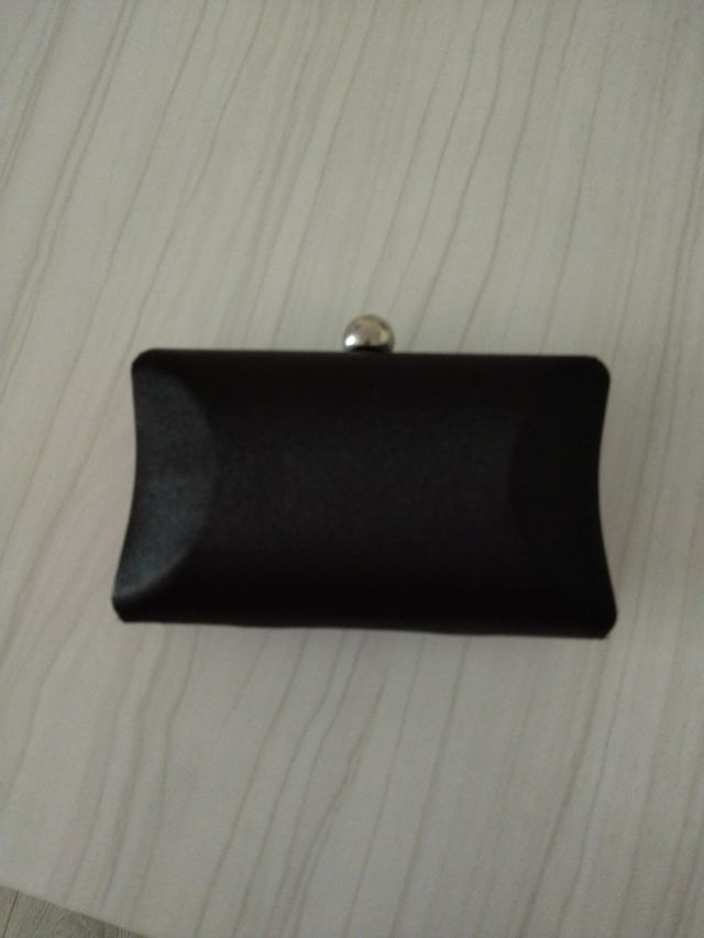 Detalles del productoCartera bolsito de mano en raso negro marca Olay, rígido, con cadena para podérselo colgar, por dentro forrado en un precioso tono dorado