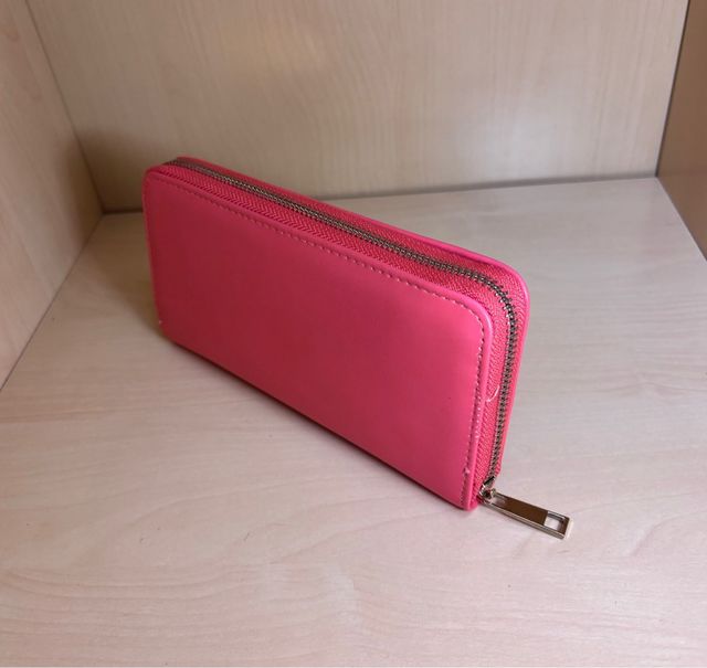 Detalles del productoElegante cartera de color coral con cierre de cremallera.
