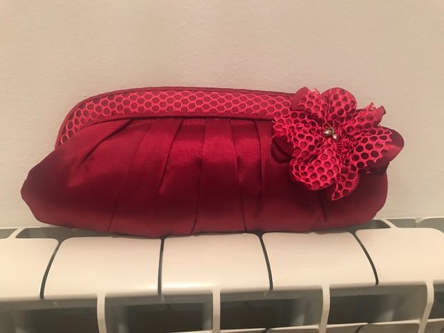Cartera de fiesta en color fucsia con adorno , lleva una cadena por dentro. La tela es raso
