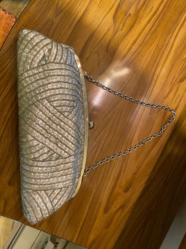 Cartera de fiesta, color champán. Delantero con abalorios y parte trasera en raso. Con boquilla plateada y cadena plateada de 45 cm.Mide 28x 12x 3 cm