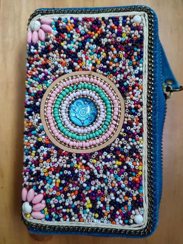cartera con abalorios y piedritas. Está muy bien porque tiene muchos compartimentos: para tarjetas, monedas, documentos.