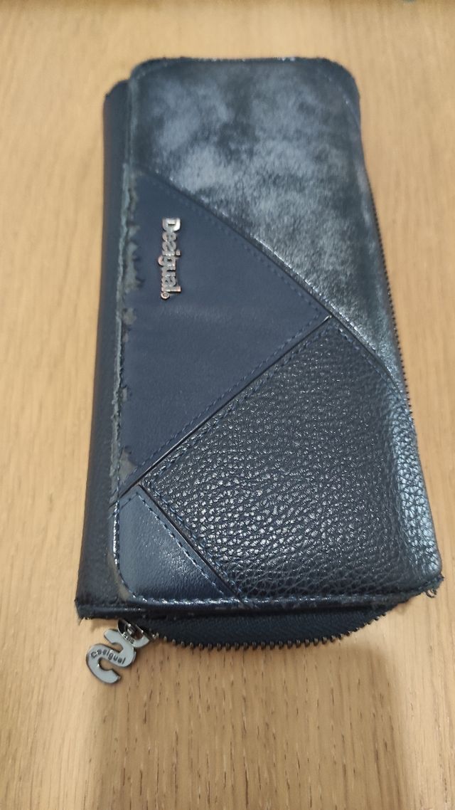 cartera azul marca desigual, muy usada(foto), una parte para tarjetas y billetes y otra para monedas.