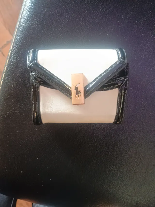 Elegante cartera de la marca Polo Ralph Lauren. Diseño bicolor en blanco y negro con detalles en charol. - Cierre con broche dorado. - Logo de caballo de Polo grabado.