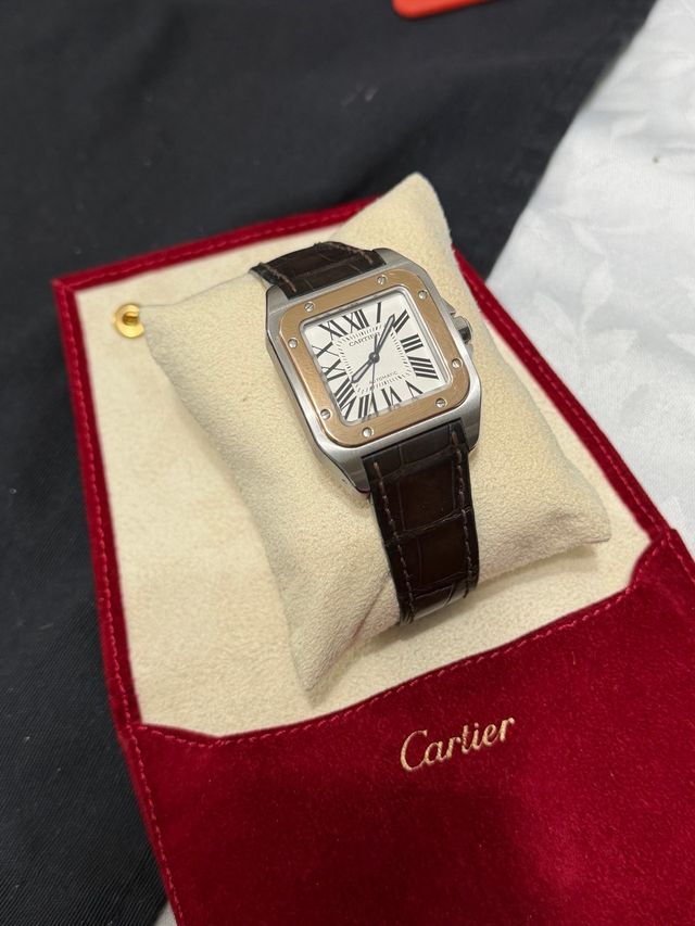 Detalles del productoElegante reloj Cartier Santos 100 con caja de acero y bisel de oro.
