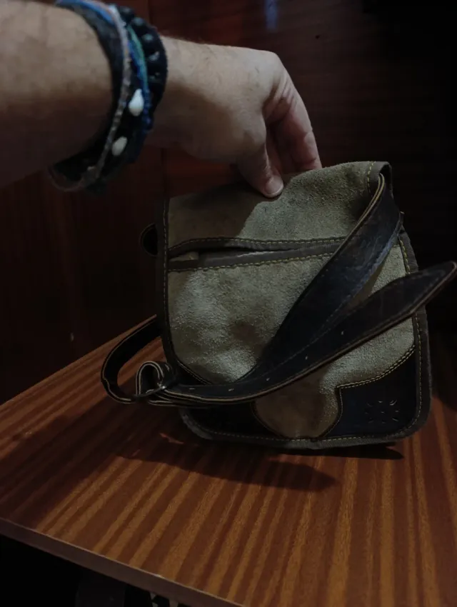 Cartuchera , elaborada en cuero y gamuza. - Diseño con solapa. - Correa ajustable. - Detalle de pespuntes.