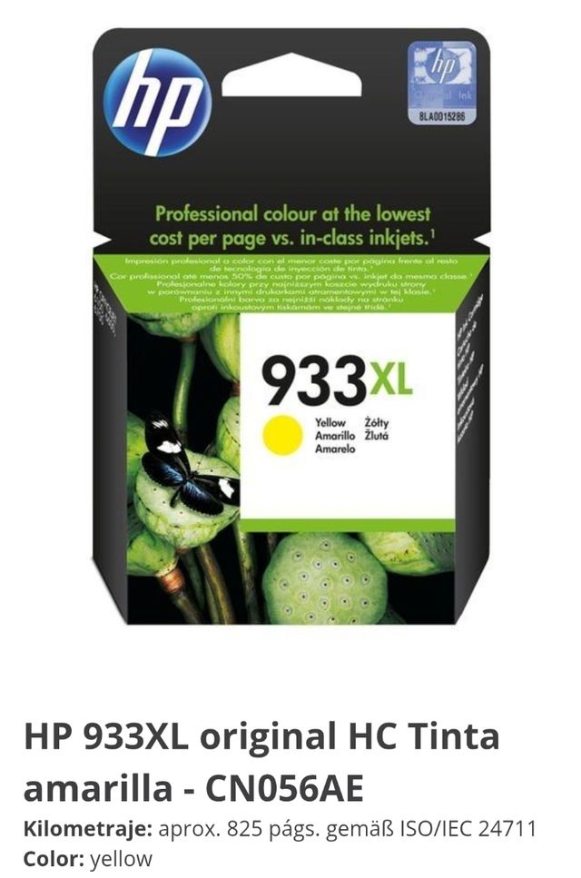 Cartucho de tinta original HP 933XL en color amarillo. - Modelo: CN056AE - Rendimiento aproximado: 825 páginas (ISO/IEC 24711) - Color: Amarillo