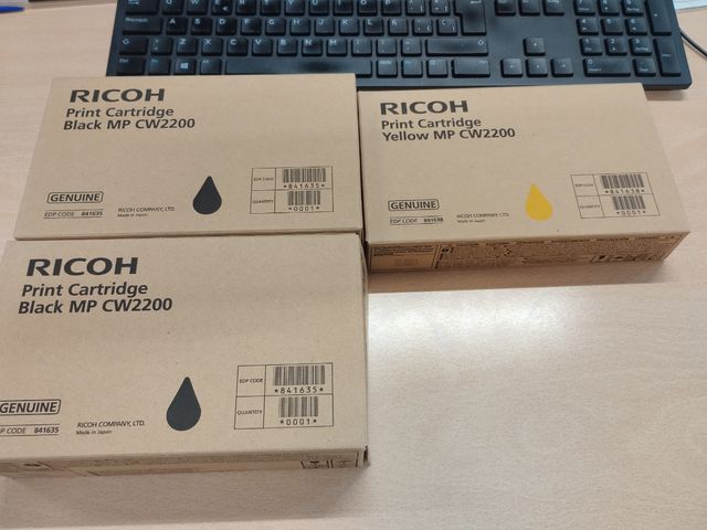 Se venden cartuchos de tinta Ricoh MP CW2200, dos en negro y otro amarillo. Ambos son originales. Se venden por separado. Negro 200 ml: 50€/cada uno Amarillo 100 ml: 25€